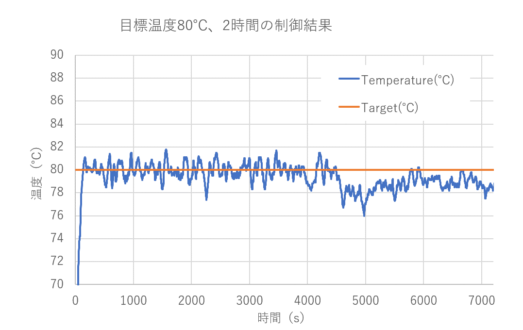 グラフでは1時間を超えたあたりから目標温度より1~2℃低下していますが、制御を停止したため、その後の挙動は未確認です。未検証の部分はあるものの、少なくとも1時間程度の制御では±2℃の精度を達成できることが分かりました。